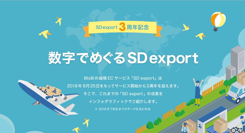株式会社ラクーン(本社:東京都中央区、代表取締役社長:小方 功) が運営する卸・仕入れサイト「スーパーデリバリー」の越境ECとなる「SD export」は、2018年8月25日でサービス開始から3周年を迎えることを記念し、これまでのSD exportの成長を振り返るインフォグラフィックを公開しました。
