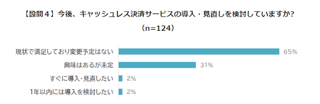 4. 今後の導入・見直し:「現状で満足しており変更予定はない」が65%と最多。「興味はあるが未定」が約3割を占め、積極的な導入意向は少数にとどまった。