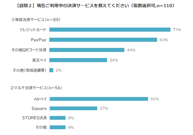 また、複数の手段(クレジットカード決済、電子マネー決済、Apple Pay、QRコード決済など)を利用できるマルチ決済端末サービスで利用中の回答が最も多かったのは「Airペイ(55%)」、次いで「Square(27%)」「STORES決済(9%)」となりました。