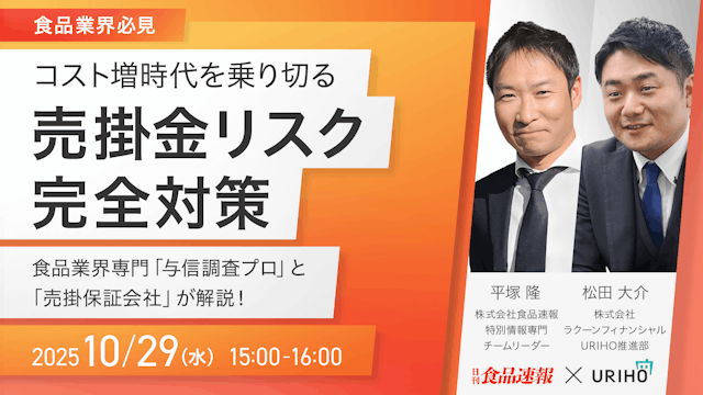本セミナーでは、食品業界専門調査会社「食品速報」と売掛保証サービスの「URIHO」が、業界動向分析と危うい企業の見分け方や最新の対策手法を徹底解説します。守りと攻めを両立する経営手法のヒントをお持ち帰りいただけます。