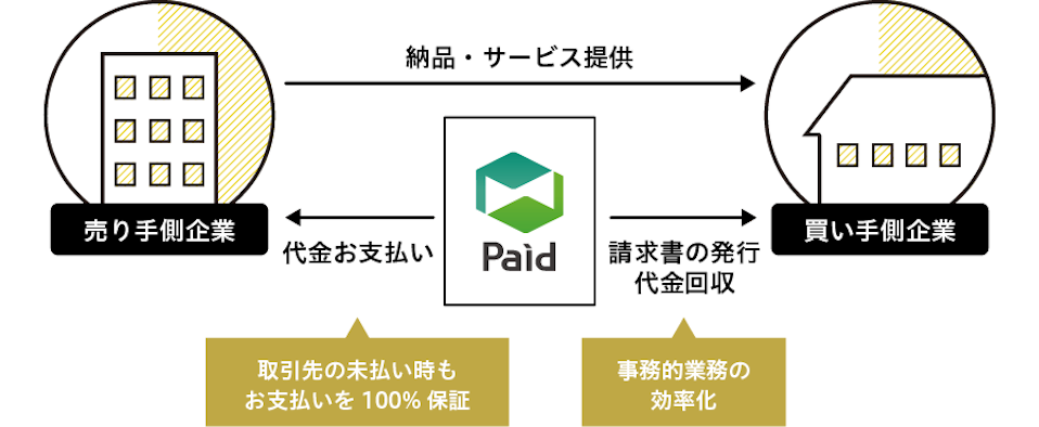 そこでPaidは、売り手側の企業に代わって与信管理から代金回収業務までをすべて代行し、未入金が発生した際はPaidが100%代金をお支払いします。