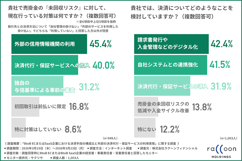 株式会社ラクーンフィナンシャル(所在地:東京都中央区、代表取締役社長:秋山 祐二)は、BtoB ECまたはBtoB SaaS企業の経営層・事業責任者・営業責任者を対象に、「BtoB ECまたはSaaS企業における決済手段の構成比と外部の決済代行・保証サービスの利用実態」に関する調査を行いました。